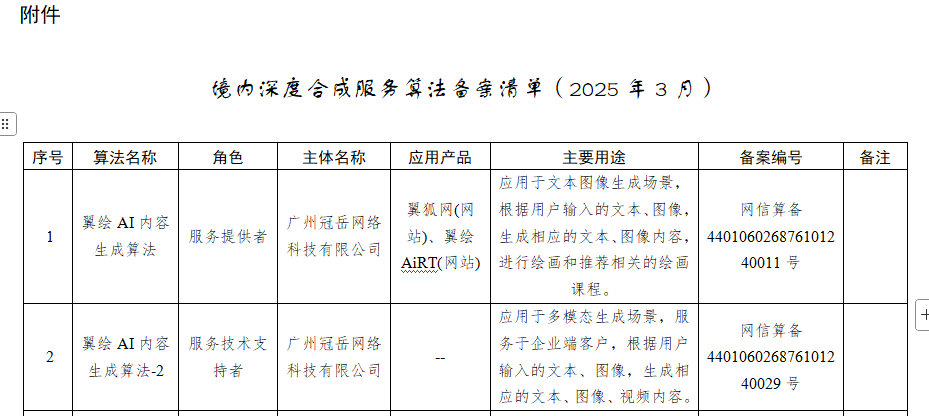 繼2024年“翼繪AI”生成式人工智能服務(wù)備案通過后,2025年,我們公司再次傳來喜訊,成功新增兩個深度合成服務(wù)算法的備案。