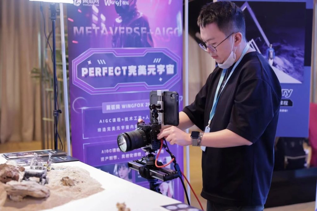會議期間,廣州冠岳為參會嘉賓現(xiàn)場演示了“小場景虛拍”、“AI數(shù)字人”、“SD繪畫”等元宇宙技術(shù)應(yīng)用,也為嘉賓們介紹翼狐網(wǎng)元宇宙相關(guān)的學(xué)習(xí)教程。現(xiàn)場嘉賓紛紛對眼前的元宇宙技術(shù)應(yīng)用裝置及演示過程展現(xiàn)出濃厚的興趣。